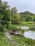 There are two main dyeing processes, one using a dye from the bark of the Techigi tree, and the other, mud. The Techigi tree is cut into chips and boiled down to a thick red liquid. The silk and cotton mats are first dyed in this dye turning them pink, and are then dyed repeatedly in the mud. The fabric goes from a light grey to a reddish brown, and finally to a rich, warm black. The tannin in the dye of the Techigi tree and the iron in the iron-rich mud react to create the black color, unique to Oshima Tsumugi.[15][16]