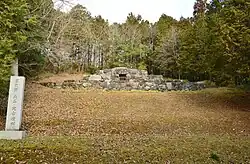 The Ōya No.1 Kofun was built on the southern slope of a hill overhanging the west bank of the Nakatsui River. The mound is rectangular, measuring 13.1 meters east–west, 9.8 meters north–south, and 3.8 meters high. It is surrounded by three tiers of stone guards, and two tiers of stones (18–22 meters in length) in front of the mound, giving the front view the appearance of a five-tier construction.The top of the mound is covered with flat stones. Excavations were conducted in 1988 and from 1992 to 1994. The burial facility is a horizontal stone chamber with two sleeves and opens in the south-southeast direction. The burial chamber was made from five megalithic stones, one each on the back wall, east wall, and ceiling, and two on the west wall. Inside was a Sue ware ceramic coffin shaped like a house and a wooden coffin. Although the burial chamber had been robbed in antiquity, a number of grave goods were found, including a pair of dragon hilt swords, arrowheads, and arrowhead-shaped gilt bronze products and both Sue ware and Haji ware pottery. The excavated hilt swords are an important cultural property designated by Okayama Prefecture.[3] The tumulus is estimated to have been built around the end of the Kofun period around the latter half of the 7th century. Although it is not clear who was buried, there is a theory that he was Prince Ishikawa no Okimi, who died in 672, who played a role in the Jinshin War and was recognized as ruler of Kibi around this time.