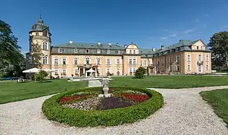 The history of Żelazno/Eisersdorf goes back to the 13th century when it was part of an ancient trade route called the Amber Road. The settlement was first mentioned as Eyserzdorf in 1326. The settlement's prosperous medieval history left its legacy, which can be seen to this day. The village also features a 15th-century[3] Gothic tower, an 18th-century[4] palace and a manor house that once belonged to the famous Münchhausen aristocratic family.[5] Prior to 1945 Eisersdorf was part of Germany and after World War II it was renamed Żelazno upon being transferred to Poland.