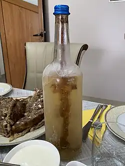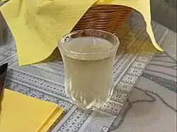 Țuică (Romanian pronunciation: [ˈt͡sujkə]) is a traditional Romanian spirit that contains ~ 24–86%[1] alcohol by volume (usually 40–55%), prepared only from plums.[1] Other spirits that are produced from other fruit or from a cereal grain are called "rachiu" or "rachie". Țuică is also the foundational element for creating the traditional Romanian vinars from different spirited fruits. In 2013, Romania produced 1.3 million hectolitres (34 million US gallons) of țuică.[2]