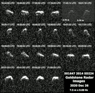 2014 SD224 was less than 90 degrees from the Sun until September 2020 when it still had a very faint apparent magnitude of 24. The asteroid was recovered on 22 November 2020 by Mt. Lemmon Survey. The asteroid came to opposition (opposite the Sun in the sky) on 12 December 2020 when it had a solar elongation of 149 degrees and a magnitude of 18.[3] It reached a peak brightness on 23 December 2020 at magnitude 16.4, which is still fainter than Pluto.