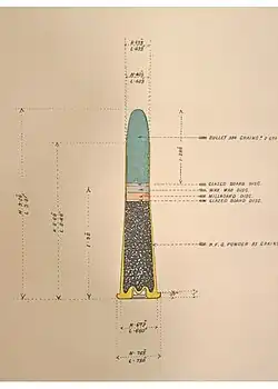 'Cartridge Machine Gun Ball .4 inch Mark I' as drawing RL 5368 in September 1887. Headstamped as 'R↑L 87'. The bullet was a 384 gr (24.9 g) round-nosed unjacketed lead bullet of an alloy of 56:1:1 parts lead:tin:antimony. There was no cannelure and it had a white paper patch contained entirely within the case. The propellant was about 85 grains of RFG2[iv] blackpowder surmounted by two cloth wads with a beeswax wad between them. Muzzle velocity was about 1,570 ft/s (480 m/s).[2]