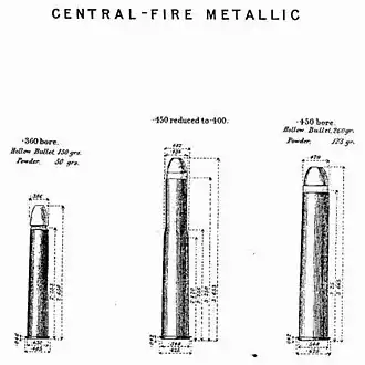 Around 1880 this cartridge was necked down to .405 inch to make the .450/400 Black Powder Express which in turn, when loaded with cordite, became the .450/400 Nitro Express which was further developed into the .400 Jeffery Nitro Express.[1]