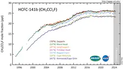 5. ^ a b "HCFC-141b". NOAA Earth System Research Laboratories/Global Monitoring Division. Retrieved 2021-02-12.