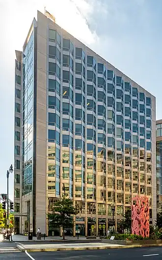 The architect of the current building was James Ingo Freed, who teamed with New York firm of Pei Cobb Freed & Partners to design the postmodern structure of the building.[4] This was one of several projects, including the United States Air Force Memorial that were underway when the architect died in 2005.[5] The previous building was valued at approximately US$25,000,000.[2][6] The previous building served as the headquarters for real estate agency, Manta.[7] The previous building rose to 153 feet (47 m); due to the Heights of Buildings Act of 1910, the building's height was restricted to being lower than the width of the right-of-way of the avenue on which the building fronts. The new 1000 Connecticut Avenue was completed in 2012. A law firm, Arent Fox, leases eight floors of the building.[8]