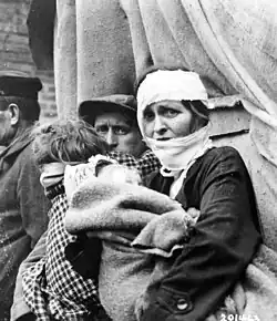 After a period of mopping up and consolidation, it participated in the trap of enemy troops in the Ruhr pocket. The 104th repulsed heavy attacks near Medebach and captured Paderborn on 1 April 1945.[18] After regrouping, it advanced to the east and crossed the Weser River on 8 April, blocking enemy exits from the Harz Mountains. On 11 April 1945 the Division was involved in the liberation of a large German concentration camp at Nordhausen.[21] The division then crossed the Saale River and took Halle in a bitter five-day struggle from 15 to 19 April.[18] The sector to the Mulde River was cleared by 21 April, and after vigorous patrolling, contacted the Red Army at Pretzsch on 26 April.[18] The division took temporary command of assets from the 69th Infantry Division in early May.[19]