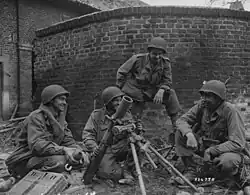 The Americans were given responsibility for taking 22 miles of wet, low country from the Belgian border to the Meuse (Maas). The width of their front was approximately 8,000 yards. General Allen planned to employ all three of his regiments at the same time, shoulder to shoulder. The 104th began combat operations on 25 and 26 October and began to attack the Germans, who offered varying levels of resistance. Along the division's front, the Germans were spread thinly and did not have continuous lines of defense. However, they did possess deadly strong points and endeavored to make the Timberwolves' progress as time-consuming and costly as possible, making heavy use of mines, booby traps, and roadblocks. Despite this, the advance was steady, though paid for in the lives of the 104th Division soldiers. Conditions were rainy, chilly, wet, and muddy. Moisture seemed to grip everything and everyone. Sleet beat down on the troops, who went for days soaked to the skin and slimy with mud.[17] On 30 October, after five days of continuous operations the division had pushed about 15 miles to within sight of the Mark River and had liberated Zundert, gained control of the Breda-Roosendaal Road, and overrun the Vaart Canal defenses.[14] Leur and Etten fell as the division advanced to the Mark River, arriving there by 31 October.[14] A coordinated attack over the Mark River at Standdaarbuiten on 2 November established a bridgehead and the rest of the division crossed the river. With the Allies firmly on the north side of the Mark River, German resistance collapsed. For the next two days, the Timberwolves pursued enemy remnants north to the Meuse. Zevenbergen was captured and the Meuse was reached on 5 November.[14] That same day, General Allen received orders from the U.S. First Army, releasing it from Canadian control. While the bulk of the division moved near Aachen, Germany, elements remained to secure Moerdijk until 7 November, when they were relieved.[14] During this time, the division was reassigned to VII Corps of the U.S. 1st Army, also part of the Twelfth Army Group.[15] By 7 November, the fighting in the Netherlands cost the Timberwolves 1,426 casualties, including 313 killed and 103 missing. Montgomery and the Canadian commanders sent their congratulations, and General Allen disseminated copies of their letters to his regiments and wrote a personal letter of thanks to everyone in the division, concluding with his favorite motto, "Nothing in Hell must stop the Timberwolves!" As a result of the actions of the 104th and their Allied counterparts, the Scheldt Estuary was cleared. The Royal Navy took three weeks to sweep the estuary waters clear of mines, and in early December 1944, the port of Antwerp was open to Allied shipping.