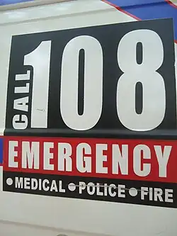 One-zero-eight is a free-to-call telephone number for emergency services in India. It is implemented by the respective state and union territory governments, mostly under Public–private partnership with funding from the National Health Mission of Ministry of Health and Family Welfare, Government of India.