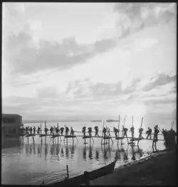 On 5 June 1942, Colonel John H. Irving became regimental commander.[11] Between 4 November and 22 December 1943, the regiment was stationed at Fort D. A. Russell. At the beginning of May 1944, Irving was replaced for health reasons by Colonel Milo H. Matteson.[12] The 124th Cavalry remained on the Mexican border with the 56th Brigade until 12 May 1944, when they were moved to Fort Riley, the last horse cavalry regiment in the army. At Fort Riley, the regiment became part of Fourth Army. After turning in its horses, the regiment left Fort Riley on 10 July, staging through Camp Anza to the Los Angeles Port of Embarkation, from which it departed aboard the transport USS General Henry W. Butner for Bombay, India on 25 July. After arriving in India with 78 officers and 1,522 enlisted men on 26 August, the regiment was transported by rail to Ramgarh Training Center, where it conducted infantry, jungle, patrol, and long range penetration training.[13] It was reorganized as the 124th Cavalry, Special on 20 September after being officially dismounted.[10][7] Five days later, the 3rd Squadron was activated in India from other regimental personnel after being reconstituted on 20 September.[2] The regiment became part of the newly activated 5332nd Brigade (Provisional), which became the Mars Task Force. As well as the 124th, the task force also included the 475th Infantry Regiment, the survivors of Merrill's Marauders, brought up to strength by replacements from the United States, and the elite American-trained and equipped 1st Chinese Regiment (Separate).[14]