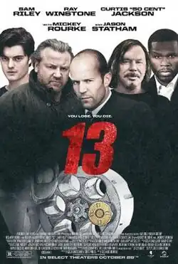 13 is a 2010 American psychological crime thriller film directed by Géla Babluani (who also directed the original), stars Sam Riley, Ray Winstone, 50 Cent, Mickey Rourke and Jason Statham. It is a remake of the 2005 Georgian-French film 13 Tzameti.