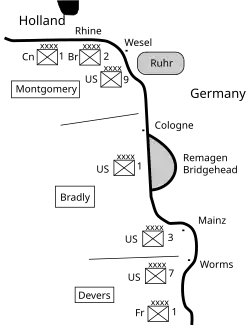 The Rhine river was a formidable natural obstacle to the Allied advance,[19] but if breached would allow the Allies access to the North German Plain and ultimately to advance on Berlin and other major cities in Northern Germany. Following the 'Broad Front Approach' laid out by General Dwight D. Eisenhower, the Supreme Allied Commander of the Allied Expeditionary Force, it was decided to attempt to breach the Rhine in several areas.[20] Field Marshal Bernard Montgomery, commanding the Anglo-Canadian 21st Army Group, devised a plan to allow the forces under his command to breach the Rhine, which he titled Operation Plunder, and which was subsequently authorized by Eisenhower. Plunder envisioned the British Second Army, under Lieutenant-General Miles C. Dempsey, and the U.S. Ninth Army, under Lieutenant General William Simpson, crossing the Rhine at Rees, Wesel, and an area south of the Lippe Canal. To ensure that the operation was a success, Montgomery insisted that an airborne component was inserted into the plans for the operation to support the amphibious assaults that would take place, which was code-named Operation Varsity.[21] Three airborne divisions were initially chosen to take part in Varsity, these being the British 6th Airborne Division, the U.S. 17th Airborne Division, and finally the 13th, all of which were assigned to U.S. XVIII Airborne Corps, commanded by Major General Matthew Ridgway.[5] However, it was discovered that there were only enough transport aircraft available in Europe to transport two airborne divisions into combat, and as such it was removed from Operation Varsity due to its lack of combat experience.[4]