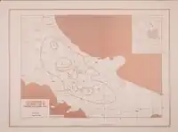 The December 5 shock struck at 23:00 local time,[10] lasting approximately 150 seconds. Devastation was reported in five of the twenty regions of Italy; Abruzzo, Molise, Campania, Apulia, and Basilicata; while some damage occurred in Lazio and Calabria.[11] Weak aftershocks were documented following the December 5 earthquake. Contemporary sources made no distinction between effects of the December 5 and 30 earthquakes.[1] Complete destruction occurred in a zone measuring 6,000 km2 (2,300 sq mi). The total area affected was 18,000 km2 (6,900 sq mi).[12] The area of devastation was unusually large compared to most earthquakes in Italy; thought to be caused by the occurrence of multiple ruptures.[13]