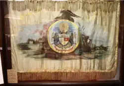 Like other regiments in Hardee's Corps, the 15th Arkansas probably carried a Hardee Pattern Battle flag, with a large white moon on a blue field, similar to flags of the 6th Arkansas Infantry Regiment. Miss Emma Rightor, representing the young ladies of Helena, presented a flag to Capt. Joseph C. Barlow of the Phillips Guards, upon the unit's return from the Seizure of the Little Rock Arsenal. The Phillips Guards became Company G, 15th Arkansas and the flag was donated to the Phillips County Museum (now the Helena Museum of Phillips County) in 1925, where it continues to be on display. the flag consisted of a white field with the seal of the state of Arkansas being the focal point and an eagle resting on top of the seal while holding the United States flag in its beak. The word "Onward" appears at the left of the seal, and "Upward" appears at the right. This flag was presented to the Phillips Guards on February 22, 1861, when there was as yet no official Confederate flag pattern to copy. It is unlikely that the flag was actually carried in any engagement.[29]