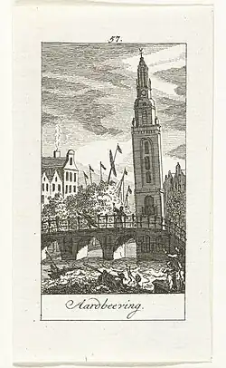 The quake was felt more in regions around the Ardennes like the Duchy of Brabant than in places like Brussels or Antwerp.[10] In Roermond, the vaults of the Minderbroederklooster collapsed. The Dutch mathematician Christiaan Huygens felt the earthquake in Hofwijck and recounted: "At half past two in the afternoon, while I was reading a book, I had suddenly and not without alarm felt an earthquake. The house clearly shook, moved back and forth, so that in the dining room paintings were beaten against the gilded leather on the walls.The stone floor where I stood lifted slightly and fell again, several times for 10 to 12 seconds."[11] Huygens presumed the quake must have been caused by an exploding gunpowder reserve in Dunkirk.[12] A tower in Amsterdam left tilted by the earthquake inspired a woodcut by Simon Fokke, titled "Aardbeeving" or "Earthquake."