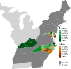 Results by county explicitly indicating the percentage of the winning candidate in each county. Shades of green are for Jefferson (Democratic-Republican) and shades of orange are for Adams (Federalist). Areas where voting records are missing or did not occur are in dark gray. Territories are in light gray.