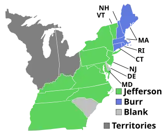 1801 Contingent Election Results. Green denotes states voting for Jefferson and blue denotes states voting for Burr. States in grey cast blank ballots.