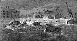 The "Great Storm"[7] (or "Great Gale"),[5] as it was known there, hit Providence, Rhode Island on the morning of September 23. From about 10:00 A.M. to noon,[7] the storm delivered a storm surge that funneled up Narragansett Bay where it destroyed some 500 houses and 35 ships. Dozens of ships were deposited on the streets of Providence.[7] The bowsprit of the ship "Ganges" was smashed into the third story of the Washington Insurance Company building.[5] The Second Baptist Meeting House was destroyed. Most of the buildings on the east side from south of the Market House to India Point were destroyed.[6] At India Point, houses and wharves were destroyed.[7] Both the Washington Bridge and the Central (Red) Bridge were uprooted from their piers and destroyed.[7]