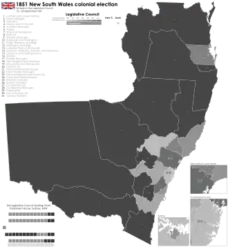 The 1851 New South Wales colonial election was held between 12 and 25 September. This election was for 36 seats in the New South Wales Legislative Council. The 1848 election had been for 5 year terms however the parliament had been reconstituted following the separation of Victoria. At the same time the council was expanded from 36 to 54 members. The Legislative Council was a hybrid system with 18 appointed members and 36 elected.[1] The Port Philip districts had 6 elected members, which meant there were an additional 18 seats. There were 3 new districts for the northern regions of what would later become Queensland, Stanley, Stanley Boroughs and the pastoral districts of Moreton, Wide Bay, Burnett, and Maranoa and 7 new pastoral districts in western New South Wales. The other 8 additional seats were distributed among the nineteen counties of New South Wales.