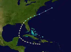 A moderately strong hurricane with winds of 105 mph (165 km/h) was first spotted on October 6 east of Jamaica. Passing a short distance south of the island, the hurricane tracked northwestward and brushed the Yucatán Peninsula before turning north-northeastward into the Gulf of Mexico.[1] Late on October 9, it made landfall a short distance east of Apalachicola, Florida, at peak winds with an estimated pressure of 965 mbar (28.5 inHg).[14] Rapidly weakening to tropical storm status, the cyclone continued northeastward and emerged into the Atlantic Ocean from North Carolina on October 11. Later that day, it was last observed about 250 mi (400 km) southeast of Cape Cod.[1]
