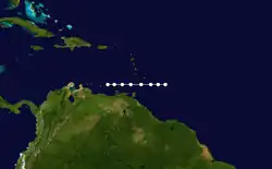 A hurricane with winds of 80 mph (130 km/h) was initially observed about 750 mi (1,205 km) northwest of the coast of Venezuela on August 13. The cyclone tracked due westward and crossed Grenada, before entering the eastern Caribbean. Heavy rain and squalls were reported in Barbados and Grenada. This system was last noted near La Orchila, Venezuela on August 14.[3][10]