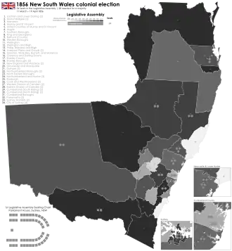 The 1856 New South Wales colonial election was held between 11 March and 19 April 1856. This election was for all of the 54 seats in the New South Wales Legislative Assembly and it was conducted in 18 single-member constituencies, 13 2-member constituencies, two 3-member constituencies and one 4-member constituency, all with a first past the post system.[2]