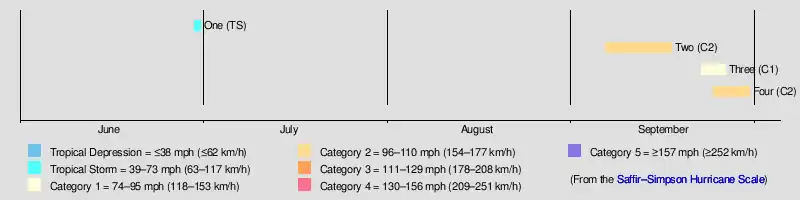 | Four | September 24–30 | Category 2 hurricane | 105 (165) | Unknown | Leeward Islands, Yucatán Peninsula, Mexico, & Texas | Unknown | None | |||