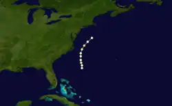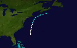The bark St. Ursula observed a hurricane about 375 mi (600 km) east-northeast of Dominica on July 28.[8] Tracking generally northwestward, the storm changed little in intensity until located to the north of Grand Turk. From there, it proceeded northwestward, and intensified to near Category 1 hurricane status. As it moved to the southwest of Wilmington, North Carolina, the storm attained its peak intensity of 105 mph (165 km/h) and a minimum barometric pressure of 969 mbar (28.6 inHg),[7] based on observations from a ship located about 140 mi (230 km) east of Norfolk, Virginia.[8] Shortly thereafter, the cyclone commenced re-curving to the northeast and began a weakening trend, falling to Category 1 strength by early on August 2. Further weakening occurred while the hurricane was located to the west of Sable Island. The storm was last reported to the south of Cape Race on the island of Newfoundland on August 3.[7]
