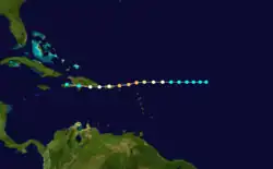 This tropical storm is known from having wrecked the schooner Three Sisters on the night of October 9 at Saint Martin in the eastern Caribbean.[24] Neither Fernández-Partagás and Diaz nor the Atlantic hurricane reanalysis project could construct a track beyond the single point, with the cyclone possessing sustained winds of 45 mph (75 km/h).[3] The storm may have been associated with other weather reports in the Lesser Antilles. For example, Barbados recorded 7 in (180 mm) of precipitation on October 7.[24] Some ships were wrecked in the Lesser Antilles, especially on Martinique, which also reported damage to ships, plantations, and several buildings.[25] Puerto Rico also reported flooding and shipwrecks on October 13. However, it is uncertain if impacts in any areas other than Saint Martin were related to the cyclone.[24] Chenoweth traced this cyclone back October 8 as a tropical storm just east of the Windward Islands, passing over Martinique that day. The storm intensified into a hurricane and clipped Puerto Rico before striking the Dominican Republic. Another landfall occurred on Cuba as a tropical storm, before the system dissipated over the island on October 12.[6]