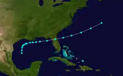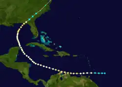 On September 21, a tropical storm was first observed east of Grenada and Saint Vincent.[17] Moving westward at a low latitude, the cyclone intensified into a hurricane early the next day while moving between Grenada and Tobago. The storm then remained close to the coast of South America while strengthening, becoming a Category 2 hurricane on the present-day Saffir–Simpson scale on September 23. Early on the next day, the system curved west-northwestward before striking Venezuela's Paraguaná Peninsula and Colombia's Guajira Peninsula. The cyclone turned northwestward by September 26, passing near the northeast tip of Mexico's Yucatán Peninsula.[3] Upon reaching the central Gulf of Mexico, the storm began trekking to the north-northeast on October 1 and then to the northeast by the next day.[3]