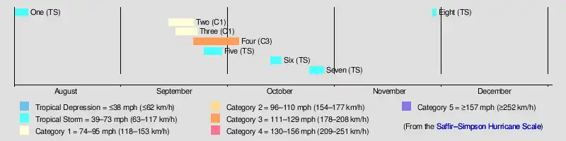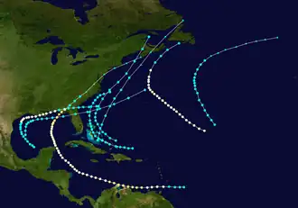 The track for the first known storm begins on August 1 near the Turks and Caicos Islands and ends after the cyclone struck New Brunswick four days later.[3] Three people drowned after that cyclone sank the schooner Vanname.[6] September featured four systems, three of which intensified into hurricanes.[3] High tides, heavy rainfall, and strong winds from the season's storm produced almost $500,000 in damage in Texas and Louisiana.[7] Later in September, the season's fourth cyclone caused devastation in areas throughout its path, inflicting more than $2 million in damage and at least 84 deaths, mostly on Curaçao.[8][9] Two tropical storms are known to have existed in October. The eighth and final cyclone of the season is estimated to have developed by November 28 near Exuma in the Bahamas. Moving northeastward, the system transitioned into an extratropical cyclone on November 29 prior to crossing Atlantic Canada.[3]