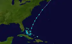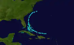 Observations from Cuba and Jamaica indicated that a storm existed to their northeast on September 24.[25] Consequently, the track listed in HURDAT begins about 150 mi (240 km) northeast of the Dominican Republic. The cyclone moved west-northwestward, crossing through the Turks and Caicos Islands and the Bahamas, striking or passing near many islands including Acklins, Crooked Island, and Long Island before turning in a general northward direction east of Andros on September 26. Thereafter, the storm passed near or over islands such as New Providence and Grand Bahama before exiting the Bahamas on the next day. After passing the Bahamas, the cyclone moved parallel to the southeastern coast of the United States and intensified to sustained winds of 60 mph (95 km/h) on September 28,[3] based on reports from the ships Magnolia and Gulf Stream and Cape Henry, Virginia.[10] On September 29, the storm was last noted about 115 mi (185 km) east-southeast of Buxton, North Carolina.[3]