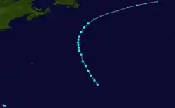 Although the steamer Antonio Lopez may have encountered this storm as early as September 11, a track could not be constructed as far back as that date because the location of the ship was not logged.[15] Instead, the Atlantic hurricane database (HURDAT) initiates the track as a Category 1 hurricane about 900 mi (1,450 km) northeast of the Lesser Antilles on September 16.[3] Reports from the ship Harley John and an unnamed vessel indicated the cyclone possessed sustained winds of 80 mph (130 km/h).[10][3] The hurricane moved generally northwestward for a few days until turning northward on September 20. Curving northeastward on the following day, the cyclone weakened to a tropical storm on September 22 before being last noted several hours later just offshore Newfoundland's Burin Peninsula.[3]