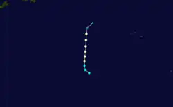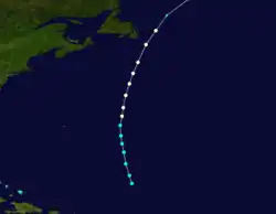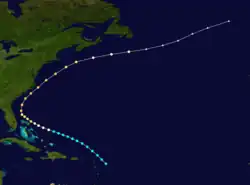 On August 14, HURDAT begins the track for this system just east of the Leeward Islands,[7] the same day that Saint Kitts reported squalls and falling barometric pressures.[5] Moving northwestward and then west-northwestward, the cyclone intensified into a hurricane by August 17. On the following day, the system passed within 40 mi (65 km) of the Abaco Islands, likely as a Category 2 hurricane. The hurricane then began curving northeastward on August 19 and intensified into a Category 3 hurricane. Sustained winds likely increased slightly to 120 mph (195 km/h) as the storm passed just offshore North Carolina on August 20,[7] based on the steamship City of San Antonio recording a barometric pressure of 967 mbar (28.6 inHg).[5][31] The hurricane continued out to sea and transitioned into an extratropical cyclone on August 22 about 250 mi (400 km) southeast of Cape Race, Newfoundland.[7]