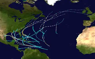 The Atlantic hurricane database (HURDAT) officially recognizes that 19 tropical cyclones formed during the 1887 season, 11 of which strengthened into a hurricane. Although both numbers set a record at the time, this activity has been surpassed or equaled many times, first in the 1933 season, which featured 20 tropical storms, while tying for the amount of hurricanes. Later, the 1969 season became the first to exceed the 1887 season's number of hurricanes, with 12. Currently, the seasonal records for most tropical storms is 30 and the most hurricanes is 15, set in 2020 and 2005, respectively.[1] Five storms existed outside the modern-day boundaries of an Atlantic hurricane season – June 1 to November 30 – which is also a record.[4]