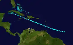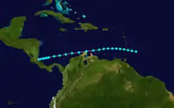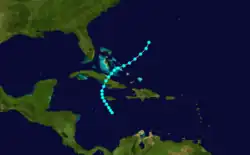 Although no observations related to this storm have been found prior to August 5,[29] HURDAT begins its track well east of the Windward Islands on July 30. Moving northwestward, the cyclone passed over or near Saint Vincent and the Grenadines on August 2 while entering the Caribbean. As the storm was located south of the Dominican Republic on August 5,[7] the bark Florence, stationed at the Turks and Caicos Islands, recorded winds of 58 mph (93 km/h) and a barometric pressure of 1,001 mbar (29.6 inHg).[30] Early the next day, the cyclone brushed Haiti's Tiburon Peninsula and then continued northwestward. The system dissipated near the western tip of Cuba on August 8.[7]