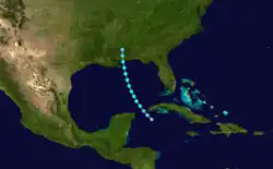 The bark Florence, stationed at Barbados on July 20, recorded squally weather and decreasing barometric pressures.[23] Consequently, the track for this system begins on that day about 150 mi (240 km) southeast of the island. Later on July 20, the cyclone entered the Caribbean after passing through Saint Vincent and the Grenadines. Intensifying into a hurricane early the next day, the storm reached Category 2 status on the modern-day Saffir–Simpson scale on July 22. After moving west-northwestward for its duration thus far, the hurricane turned northwestward over the northwestern Caribbean on July 25. The cyclone struck the northeastern Yucatán Peninsula later that day and curved northward. Weakening to a Category 1 hurricane over the Gulf of Mexico, the storm turned north-northeastward. Around 15:00 UTC on July 27, the hurricane made landfall near Fort Walton Beach, Florida, with winds of 85 mph (140 km/h), with an estimated barometric pressure of 978 mbar (28.9 inHg). The storm continued north-northeastward as a tropical storm, before dissipating late on July 28 near Atlanta, Georgia.[7] [23]