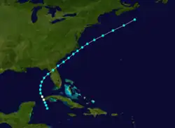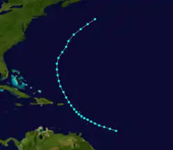 As meteorologist Ivan Ray Tannehill in 1938 documented this storm as far back as September 29,[7]: 37 the official Atlantic hurricane database initiates the track on that date about 425 mi (685 km) northeast of Paramaribo, Suriname. Moving northeastward, the storm struck Dominica late on October 1 with winds estimated at 50 mph (85 km/h). The storm passed through the British Virgin Islands on the following day. After re-emerging into the Atlantic, the system curved north-northwestward on October 3 and then northeastward on October 4. As the cyclone neared Bermuda on October 5, it nearly became a hurricane, peaking with winds of 70 mph (110 km/h). On October 6, the storm was last noted approximately 270 mi (435 km) southeast of Sable Island, Nova Scotia.[6]