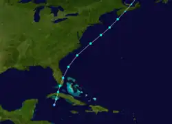 Although reports suggest the presence of a tropical depression over the northwestern Caribbean starting on October 4, the official track begins on the following day, when the existence of a closed circulation could be confirmed.[4] Moving quickly northeastward, the depression struck the Zapata Swamp of Cuba and entered the Straits of Florida less than six hours later. Intensifying into a tropical storm late on October 5, the cyclone made landfall near Marathon, Florida, around 23:00 UTC. A second landfall occurred in Florida around 01:00 UTC the next day near Flamingo, about five hours before the storm emerged into the Atlantic near Stuart.[6] Because ships recorded barometric pressure as low as 1,002 mbar (29.6 inHg) on October 7,[7]: 38 the storm is estimated to have peaked with winds of 60 mph (95 km/h). The system transitioned into an extratropical cyclone later that day, just prior to striking near Northwest Cove, Nova Scotia. After crossing Nova Scotia, the extratropical remnants turned northward over the Gulf of Saint Lawrence, crossing far eastern Canada before dissipating over the Labrador Sea on October 11.[6] Chenoweth also proposed the removal of this storm from HURDAT, finding "No evidence in land-based reports or from ships".[5]