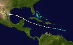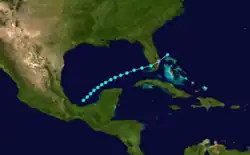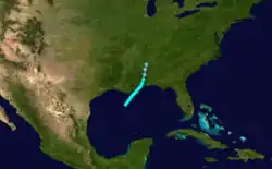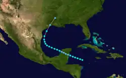 The track for this system begins over the northwestern Caribbean on October 2, despite Fernández Partagás and Diaz expressing skepticism about the cyclone's early stages due to the proximity of the previous storm.[6] Moving west-northwestward, the storm struck the Yucatán Peninsula on October 4 and quickly weakened to a tropical depression. After emerging into the Gulf of Mexico early on October 5, the storm quickly re-strengthened into a tropical storm. By October 6, the cyclone turned northeastward, making landfall in Galveston, Texas, early the next day. After moving inland, the system rapidly weakened, dissipating over northern Louisiana on October 7.[5] Due to no reports of gale-force winds, including Louisiana and Texas only recording sustained winds of 29–35 mph (47–56 km/h), the Atlantic hurricane reanalysis project concluded that the cyclone was, at most, a minimal tropical storm.[3]