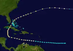 The official track for this begins about 1,000 mi (1,610 km) east of Barbados on October 12. Moving westward to west-northwestward, the system passed through the Windward Islands three days later. After entering the Caribbean, the storm intensified into a hurricane on October 16 and to Category 2 hurricane about 24 hours later, peaking with winds of 105 mph (165 km/h). The hurricane turned northward on October 19, passing just west of the Cayman Islands on the next day. Thereafter, the cyclone curved north-northeastward and made landfall in Cuba near the city of Cienfuegos around 18:00 UTC on October 21. Quickly emerging into the southwestern Atlantic early the next day, the storm struck Grand Bahama island in the Bahamas shortly after 12:00 UTC. A more northeasterly motion then commenced and the hurricane crossed over or near Bermuda on October 24. The system likely began weakening significantly on the following day and transitioned into an extratropical cyclone about 700 mi (1,125 km) southwest of Flores Island in the Azores on October 26. The extratropical remnants dissipated several hours thereafter.[5]