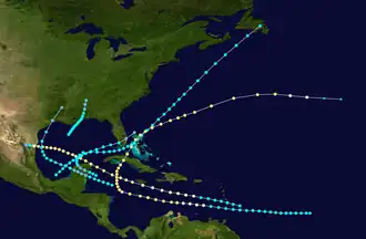 Ships detected the season's first known cyclone on August 14 over the Gulf of Mexico. Striking Louisiana and Mississippi, the storm dissipated on August 17. Later in August, the second cyclone traversed the Caribbean before striking the Yucatán Peninsula on August 27 as a hurricane and then making another landfall in Mexico in Tamaulipas on August 30. On September 28, the track for the season's third system begins in the northwestern Caribbean Sea. Remaining a tropical storm, the cyclone struck the Yucatán Peninsula, the Bahamas, and Newfoundland before dissipating on October 7. The final three known tropical cyclones developed in October, with the first and third of those storms remaining minimal tropical storms. However, the second October storm – the fifth Atlantic cyclone of the year – struck Cuba and the Bahamas and moved near or over Bermuda at hurricane intensity until transitioning into an extratropical cyclone on October 26, concluding seasonal activity.[5]