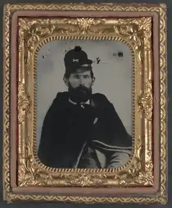 Private Archibald D. Council of Co. K, 18th North Carolina Infantry Regiment, in uniform and wrapped with hospital blanket
