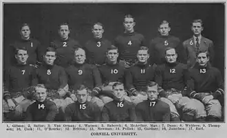 The 1906 Cornell Big Red football team was an American football team that represented Cornell University during the 1906 college football season. In their fifth, non-consecutive season under head coach Pop Warner, the Big Red compiled an 8–1–2 record, shut out 6 of 11 opponents, and outscored all opponents by a combined total of 237 to 37.[1][2] Three Cornell players received honors on the 1906 College Football All-America Team: guard Elmer Thompson (Walter Camp-1, Caspar Whitney-2); center William Newman (Whitney-1); and fullback George Walders (Whitney-2).[3][4]