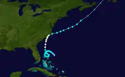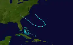Historical weather maps indicate the presence of a tropical storm about 535 mi (860 km) east-northeast of Barbados on September 7.[1][5] Moving west-northwestward, the storm passed just north of the Lesser Antilles and slowly intensified, becoming a hurricane just offshore the Dominican Republic early on September 11. Thereafter, the cyclone strengthened more quickly, becoming a Category 2 hurricane just prior to striking Inagua in the Bahamas several hours later with winds of 100 mph (160 km/h). Around 12:00 UTC on September 12, the system strengthened into a Category 3 hurricane and peaked with maximum sustained winds of 120 mph (190 km/h) by early the following day. The storm curved northward and passed over or near several islands on September 13 and September 14, including Exuma, Cat Island, and Eleuthera. Later on September 14, the cyclone turned northeastward and exited the island chain. While traversing the open Atlantic, the system slowly weakened and remained a hurricane until falling to tropical storm intensity late on September 18 while just offshore Newfoundland. The storm soon struck the island and became extratropical near Port Rexton. The extratropical remnants continued northeastward and dissipated over the Labrador Sea late the following day.[1]