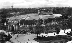 The match, played on a sunny Sunday, 15 May 1910 was Italy's first official international game.[1] The match was set to be played at the Arena Civica in Milan which did not typically host football matches as it was mostly a venue for chariot races and circus shows. La Stampa and Guerin Sportivo reported the presence of 4,000 spectators, while others suggested up to 8,000.[7] The French had just lost 4–0 and 10–0 against Belgium and England respectively.[5] They reached Milan on a ten-hour overnight journey.[4] They played with a white-and-light-blue-striped shirt with red hand-guards.[4] Instead, Italy played in a white shirt with starched collar and cuffs; above the breast pocket, a tricolor rectangle is stitched.[4] The players could wear socks of their choice.[8]