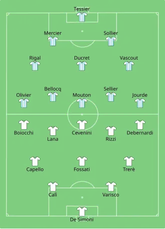 All players game from a Paris club. Notably, Étoile des Deux Lacs had six starters. Other such clubs were AS Bon Conseil, l’AF La Garenne-Colombes et le CA Vitry, who provided three players including captain Étienne Jourde.[6] France could not lean on the players coming from their top teams such as Racing Club, Stade Rennais, Patronage Olier, and Club Français due to controversies on professional and amateur football.[7]