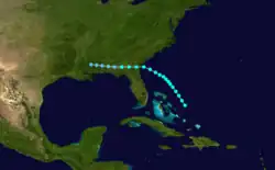 A ship initially encountered this storm about 65 mi (105 km) north-northeast of San Salvador Island in the Bahamas on July 12.[4] The storm initially moved northwestward and strengthened slowly. Early on July 14, the cyclone turned west-northwestward.[5] Later that day, a ship recorded a barometric pressure of 1,011 mbar (29.9 inHg), which was the lowest pressure in relation to the cyclone.[4] Around 12:00 UTC on July 15, the system peaked with maximum sustained winds of 50 mph (85 km/h),[5] based on an observation from Savannah, Georgia.[4] About three hours later, the storm made landfall near Darien, Georgia. The cyclone slowly weakened inland and fell to tropical depression status by 12:00 UTC on July 16. About twenty four hours, it dissipated over Mississippi.[5]
