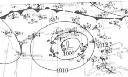 On June 7, ships in the Gulf of Mexico reported a low pressure area with a closed circulation about 100 mi (160 km) southeast of Port Eads, Louisiana.[4] Initially, the storm moved slowly southeastward, before turning west-southwestward late on June 8. Strengthening slightly, the cyclone turned to the northwest by June 11.[5] Around 12:00 UTC on the following day, a ship observed a barometric pressure of 995 mbar (29.4 inHg), the lowest known in relation to the storm. Based on this, maximum sustained winds were estimated at 70 mph (110 km/h).[4] Early on June 13, the storm curved northeastward and made landfall near Franklin, Louisiana, around 05:00 UTC. The system slowly weakened and emerged into the Atlantic Ocean from the Outer Banks of North Carolina, while still at tropical storm intensity. By 12:00 UTC on June 16, the cyclone weakened to a tropical depression. About 24 hours later, the depression dissipated about 150 mi (240 km) north of Bermuda.[5]