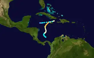 Slow intensification took place after classification as a hurricane, though after recurving northeastward, the storm began to quicken in strengthening. On November 18, the cyclone reached its peak intensity with maximum sustained winds of 115 mph (185 km/h), making it equivalent to a Category 3 hurricane.[3] Initially, it was believed that the storm became a Category 4 hurricane, but this was determined to be too strong of an intensity. A relatively small tropical cyclone, the hurricane made landfall along the western coast of Jamaica late on November 18. At the time of landfall, a pressure of 965 mbar (hPa; 28.50 inHg) at South Negril Point — the lowest barometric pressure documented anywhere during the storm's existence.[2] Despite only briefly moving inland, the hurricane quickly weakened after landfall and continued to do so upon reentry into the Caribbean Sea. On November 20, the hurricane weakened to a tropical storm south of Cuba.[3] Due to ambiguous surface observations in the area at the time, the storm was originally believed to have progressed northwards through the Atlantic before clipping Newfoundland;[4] another scenario indicating that the storm made landfall in New York also seemed possible. However, reanalysis concluded that the system instead tracked westward across the Caribbean,[2] slowly weakening before dissipating on November 22 north of Honduras.[3]