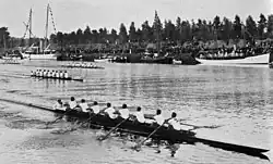 It was the first time that the German rowing federation sent competitors to the European Rowing Championships and they were immediately successful, winning two out of the five boat classes (M1x and M8+).[3] The single sculls competition descended into a farce, with the umpire twice calling for a restart. The Italian rower Giuseppe Sinigaglia and the Russian rower Anatol Peresselenzeff, who started for France, were then disqualified. In the eventual final Polydore Veirman capsized and the German rower Friedrich Graf was the only one to reach the finish line.[4]